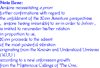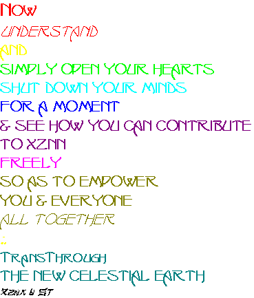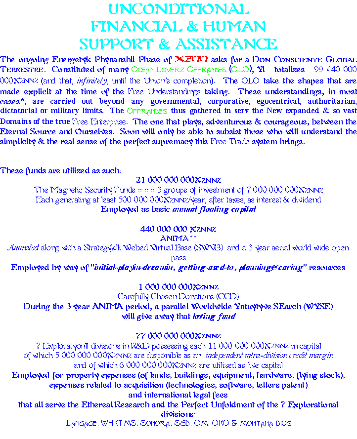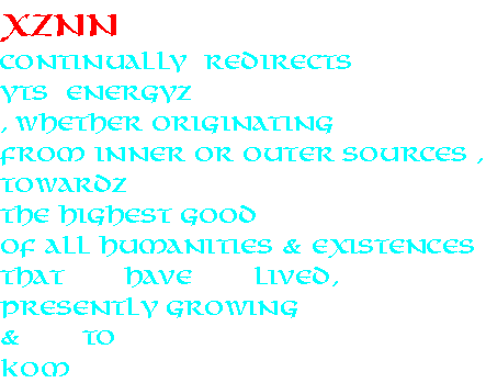 LANGAGE, the Art of Lyvyng aspect: Theoritical as well as Experiential WOODZ HAV KALLED THE MAGYK STRYNG, the Ethereal Musykll Ynstruements aspect: various percussive prototypes have been successfully constructed SONORA, the Publishing & Communication aspect: 11 Masters have already created a considerable bank of music Titles, a few precursorial Paintyngz, many scores of serious music, the MetaScript of an outstanding Cinematoghaphical Odyssey including documentaries & music videos... Sonora is also including the publishing of this SuperSite. The Communication leg is presently at a theoritical stage and promises a few global breakthroughs SAKRED GEOMETRYKLL DREAMZ, the Happenings & Events aspects: strongly prototyped and effectively experienced, ready to initiate the LocalLandscapeSupraMentalization projects 33OM, the Mashynz aspect: amazing Designs are ready to be prototyped into formidable & unique Technologies OKO, the Oqkultyzm aspect: always the presence of the OtherThan Yyz DIVINITYZ, the Divinityz aspect: Theoritical as well as Experiential. Be ready to be Loved! Already strategized and ready to be fully experienced XEO unifies by encompassiveness Xznn, Evollove & OVV Worldz and emerges as those 3 come to clear manifestation. WAVZ is soon to be incarnated and Ynfynytt Eternll, YE, yiz, in part, all of Thys. Provided proper Financing and Human Assistance, any one of these aspects is, within a 2 to 3 month period, fully engaged into complete actualizational manifestation. |